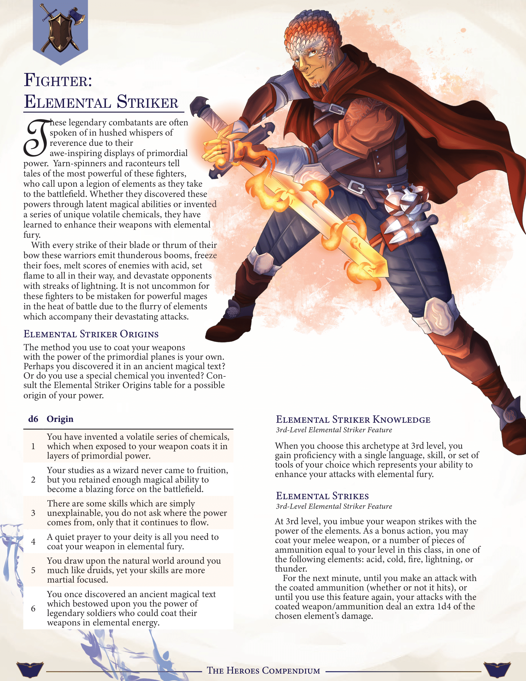These legendary combatants are often spoken of in hushed whispers of reverence due to their awe-inspiring displays of primordial power. Yarn-spinners and raconteurs tell tales of the most powerful of these fighters, who call upon a legion of elements as they take to the battlefield. Whether they discovered these powers through latent magical abilities or invented a series of unique volatile chemicals, they have learned to enhance their weapons with elemental fury.