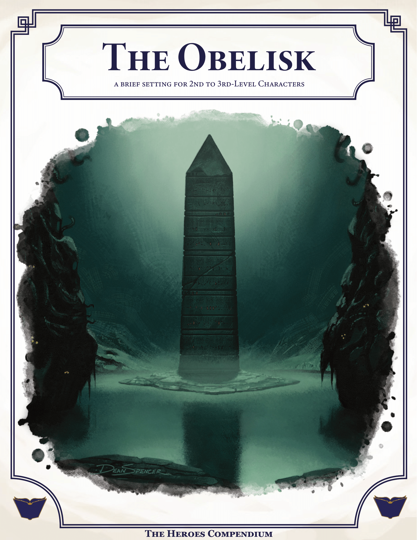In this adventure, the characters will learn there is more to fear in the dark than the voices which whisper from the shadows. A mind-bending obelisk sits at the center of a lake in a gloomy cavern. To approach the looming obelisk, the characters will test their intelligence, fight golden-eyed shadows, and attempt to find a way past craze-inducing waters.